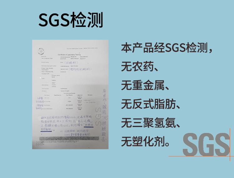 经SGS检测,无农药、无重金属、无反式脂肪、无三聚氢胺、无塑化剂